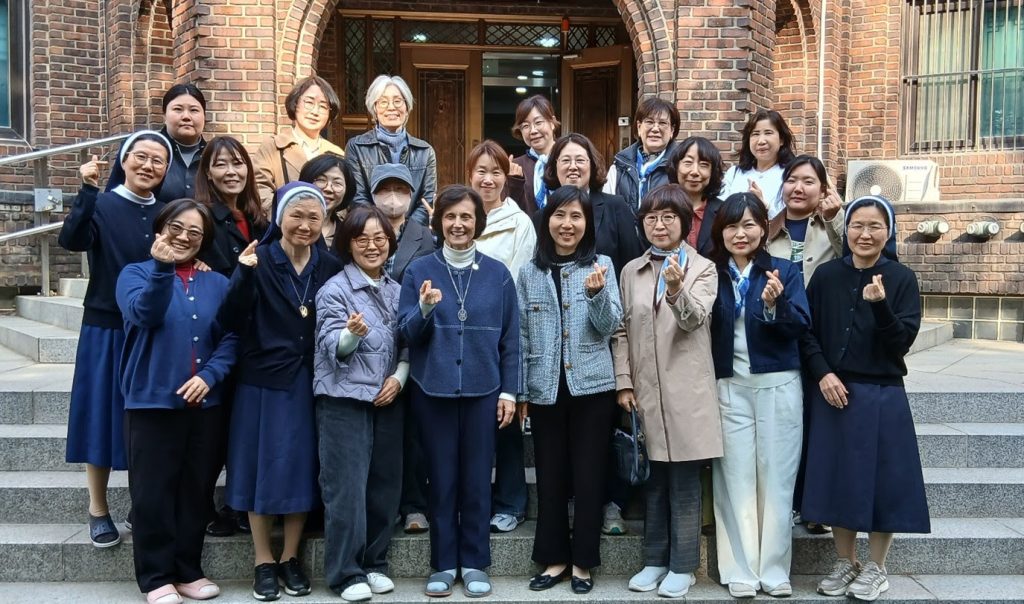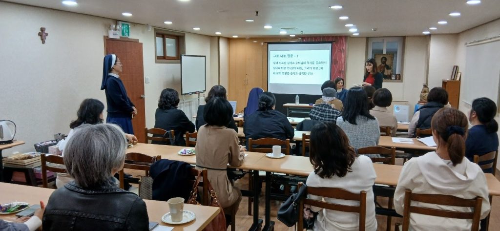 De manera especial, el 28 de marzo tuvo lugar un encuentro con la Superiora general, Madre Belén Gómez de Castro, en la comunidad de Chongnung. Participaron 16 miembros junto con las hermanas acompañantes. En el encuentro compartieron un diálogo con la Superiora, presentaron las actividades realizadas hasta el momento y ella, por su parte, ofreció una reflexión sobre la historia de M. Fundadora y el MLC internacional. Con las miembros compartimos aquellos aspectos de la historia de nuestra Madre Fundadora que más nos tocaron el corazón y también aquello que descubrimos de un modo nuevo gracias a ella. Asimismo, dialogamos sobre qué debemos hacer y cómo debemos vivir en el momento presente siendo miembros del MLC. Aunque el tiempo no fue muy amplio, fue un momento de compartir muy rico y fecundo y también una ocasión para conocer y experimentar más profundamente a nuestra Madre Fundadora.